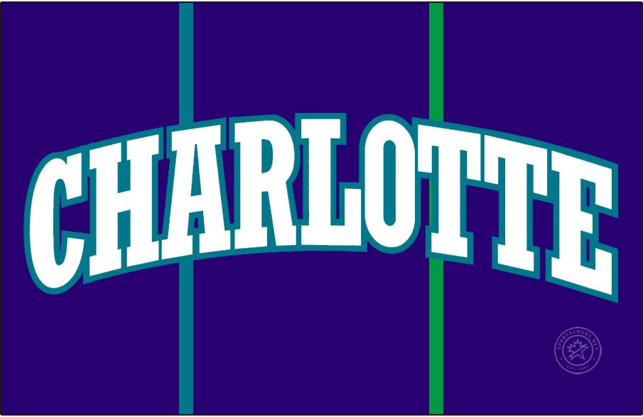 The Charlotte Hornets wore this logo across the front of their purple alternate jersey from 1994-95 to 1996-97. The logo shows CHARLOTTE arched in white with teal trim on a purple jersey with pinstripes.
