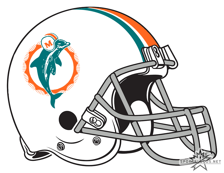 This Miami Dolphins helmet was first used in the AFL in 1968 and then brought back midway through the 1973 season. It again featured a white shell with a grey facemask and a teal, white, orange striping pattern down the middle. The logo was again an aqua dolphin wearing an orange M football helmet leaping in front of an orange sunburst, however the Dolphins moved the dolphin higher in this version causing it to be above the sunburst.