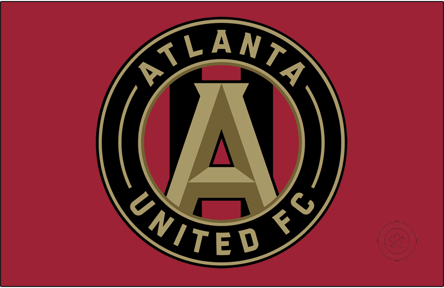 The Atlanta United FC logo features a bold gold "A" placed at the centre of a black and red striped roundel, the red and black alternating stripes referencing Atlanta's history as a railroad town. A thick gold ring encircles the design, trimmed in black and containing the club's full name in gold. The use of a roundel shape draws inspiration from the city's seal and Olympic past, symbolizing unity and connection. Introduced ahead of the club's inaugural season in 2017, the design places the strength of Atlanta at the forefront while reflecting the club’s stated pillars of unity, determination, community, excellence, and innovation.