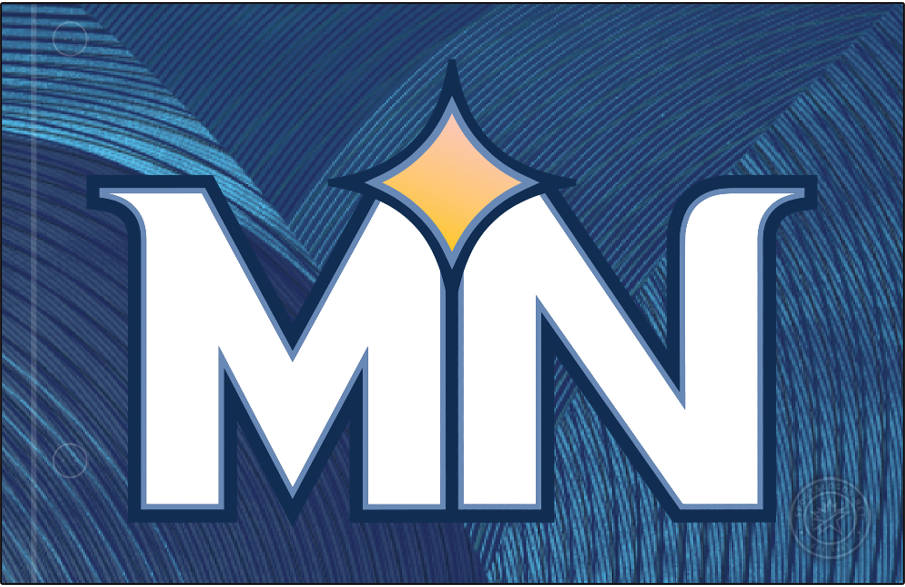The Minnesota Twins City Connect jersey logo shows the state abbreviation of MN in white with a yellow North Star in between the two letters placed on the upper left chest of a blue button-up jersey with a lake ripple effect