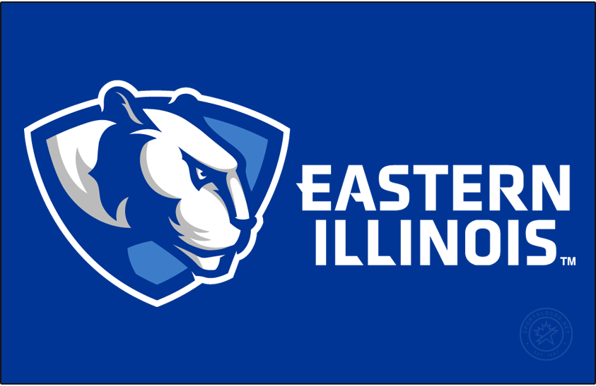 Alternate logo of a right-facing white panther head inside a shield beside stacked custom Eastern Illinois type in blue, light blue, and gray. On a blue background, the shield outline and type changes to white. EIU Athletics unveiled a new panther design & typeface in October 2015 to replace the previous designs used since 2000. The school collaborated with Collegiate Licensing Company (CLC) on the new designs & color scheme.