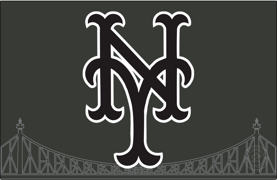 New York Mets Logo Cap Logo (2024-Pres) - The New York Mets City Connect cap shows the Mets NY logo in black with a white outline on a dark grey cap with a purple button and a bridge running along the bottom of the front panel of the crown. SportsLogos.Net