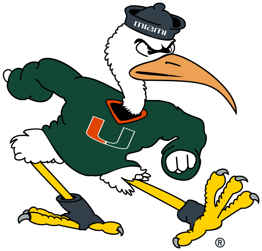 Slightly redesigned Sebastian the Ibis mascot logo with a gray sailor hat (with MIAMI wordmark) and green sweater (with Split-U logo). Was discontinued in or about 2005.