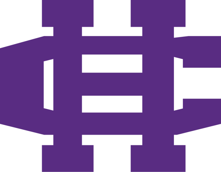 Interlocking block serif HC letters in purple. Purple was changed in or around 2000.
