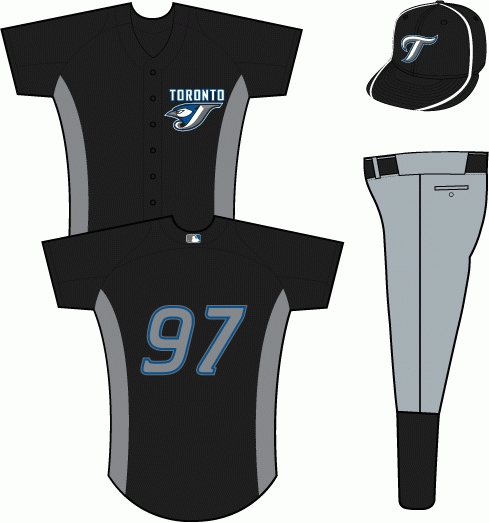 Toronto in white with a blue outline above J/Jay logo on a black uniform with grey side panels